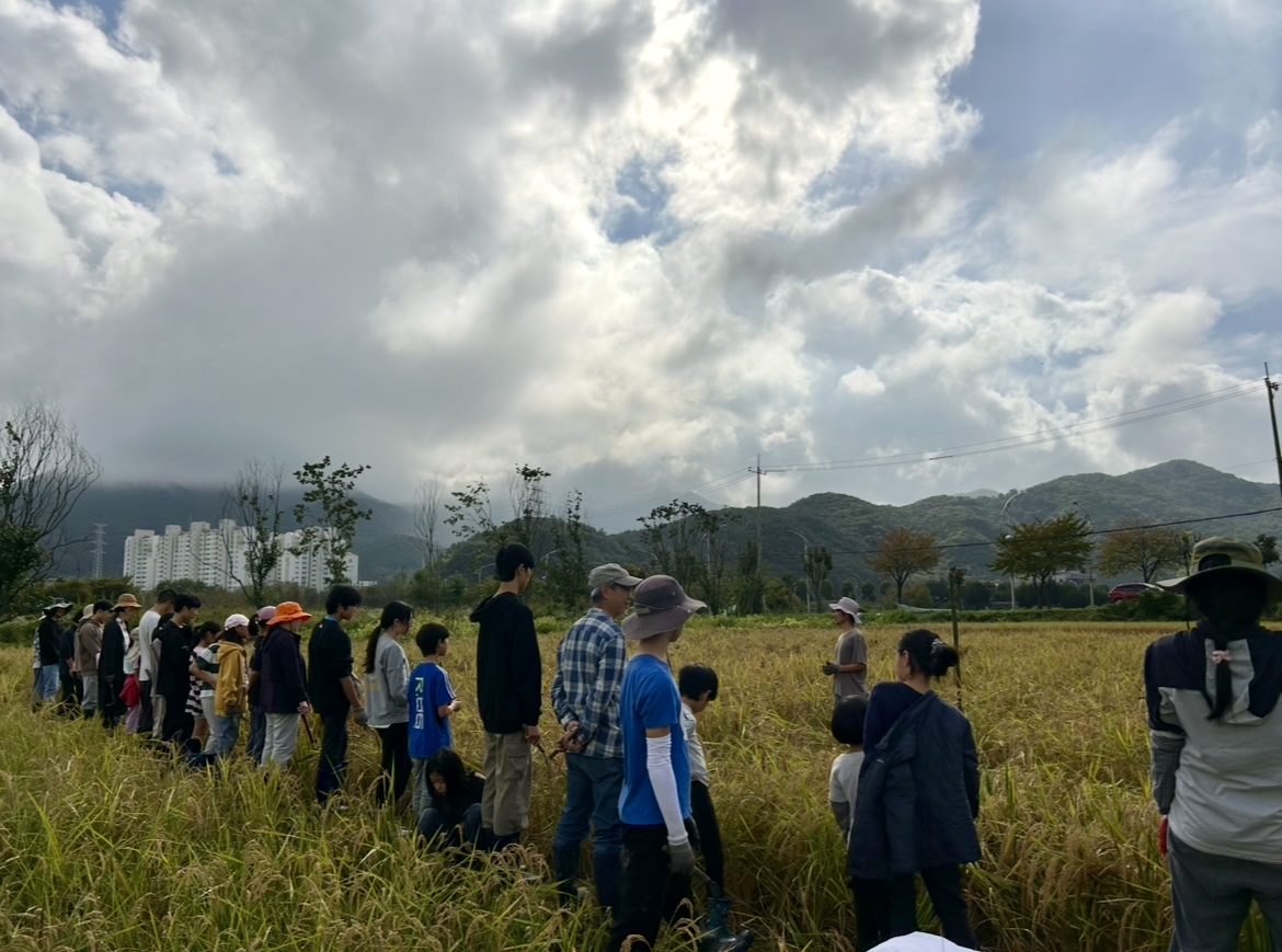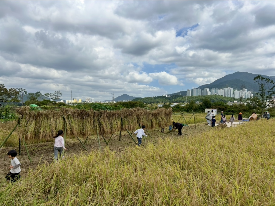 사각사각 벼 베는 소리 때문일까, 이상하게 낫질 하는 건 참 즐겁다. 낫으로 벼를 베고, 볏짚을 묶어서, 볏덕에 말리는 작업을 했다. 보통은 볏덕에서 2주 정도 햇볕과 바람에 고루 말리는 작업 이후 탈곡을 한다. 이번에는 일정 관계상 거둔 벼 일부는 아이들과 탈곡 작업까지 한꺼번에 해보기로 했다. 발로 돌리는 탈곡기, 돌판, 나무 통을 이용한 다양한 방법의 털기를 시도했다. 탈곡할 때도 혼자서 하기는 어렵다. 3~4명이 한 조가 된다. 한 사람은 볏단을 옮겨 풀어 주고, 한 사람은 탈곡기를 돌리고, 나머지 한 사람은 턴 볏짚을 정리한다. 풀벌레 소리, 벼 터는 소리, 발로 탈곡기 돌리는 소리, 북 장단 소리, 아이들의 웃음소리가 논을 가득 메웠다.