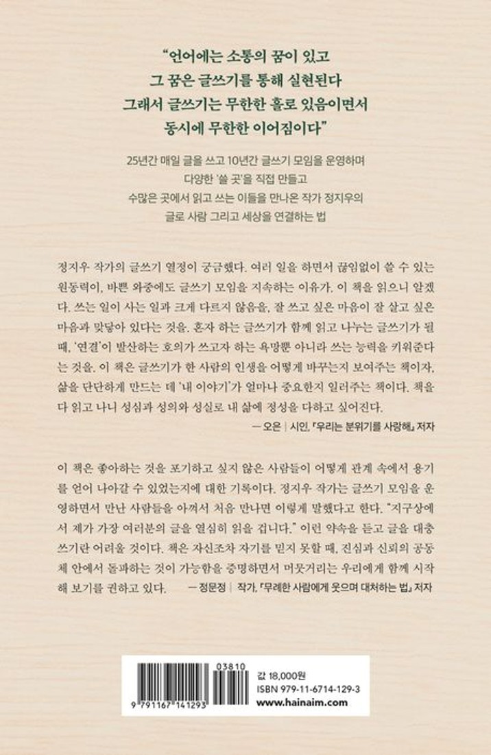 글쓰기 모임은 약 3개월에서 끝나지 않는다. 작가는 모임 이후 글을 쓰지 않는 이들이 안타까워 매년 온라인 상에서 ‘AS 모임’을 열어 글쓰기를 독려하고, 뉴스레터를 발행하거나, 공저 프로젝트도 기획해 역대 모임원을 초대했다. ‘글’이라는 매개체로 점이 아니라 선으로 연결된 덕분일까, 모임 참여 전후로 크든 작든 조금은 달라졌다고 말하는 이들이 적지 않다. 책 뒤편에 실린 후기와 그날 모인 이들의 목소리가 그 증거인 것 같다.