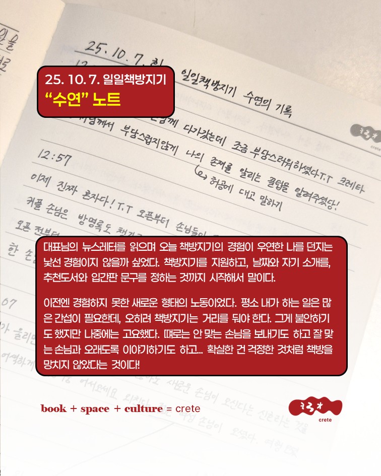 어쩌면 일일책방지기 제도는 누군가에게 특별한 하루를 선물하는 프로그램처럼 보일지도 모르겠다. 하지만 이 시간 덕분에 나 또한 특별한 하루를 선물 받는다. 외부 강의를 통해 크레타를 모르는 사람들에게 이 공간을 소개하기도 하고, 아이들과 함께 근교로 나가 주중에 제대로 하지 못한 아빠 노릇을 하기도 한다. 누군가 크레타의 하루를 맡아 서점을 열고 닫는 동안, 나는 이 공간을 혼자서만 책임져야 한다는 생각에서 조금씩 멀어지고 있다. 서점은 여전히 내가 운영하는 공간이지만, 더 이상 나 혼자의 공간은 아니라는 감각을 배우고 있다.