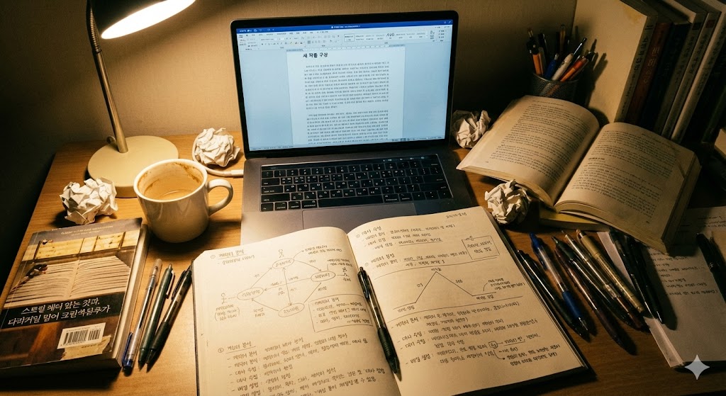 나는 많은 작품을 썼지만 작품에 공을 들이며 다듬지는 않았다. 심지어 시놉시스도 제대로 구상하지 않고 생각나는 대로 작품을 이어서 쓴 경우도 많았다. 쓰기 위한 최소한의 노력은 했지만 제대로 된 작품을 내기 위한 노력을 하지는 않은 것이다. 왜 그랬을까. 생각해 보면, 나는 노력을 한다는 게 부끄러웠다. 그것이 내 능력 없음을 증명하는 것 같아서였다. 나는 능력이 출중한 작가가 되고 싶었다. 큰 노력을 하지 않아도, 그저 아무 생각 없이 써도 대박을 내는 그런 작가가 되고 싶었다. 그래서 글을 잘 고치려고 하지 않았고 캐릭터에 대한 고민이나 스토리에 대한 고민, 연출에 대한 고민을 하지 않았다. 그런 고민을 하는 것은 능력이 없는 작가들이 하는 짓이라고 생각했기 때문이었다. 그 결과물이 이것이었다. 8년이나 쓰고도, 이런 형편 없는 결과물이 나온 것은 바로 능력의 신화에 빠진 나머지 노력을 등한시한 결과였다.