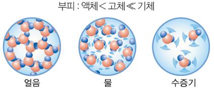 그림 1. 물은 온도에 따라 상태가 변한다. 물의 상태 변화는 온도에 따라 물 분자가 상호작용하는 방식이 달라지기 때문에 나타난다. (출처: 금성출판사 티칭백과)
