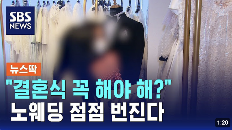 사진 1. SBS 뉴스 유튜브 채널에 올라온 영상 ‘“결혼식은 안 해도 되죠?” … ‘스드메 생략’ 노웨딩 번진다’의 썸네일 |